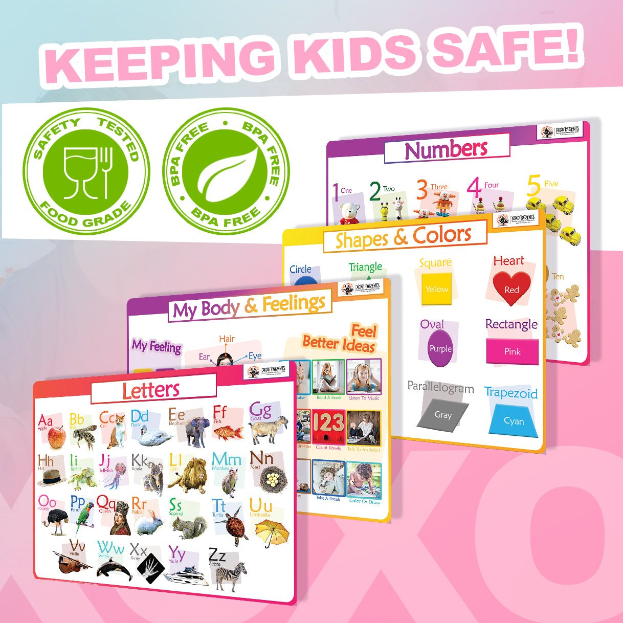 - GET YOUR BABY READY FOR SCHOOL: Help your children get ready for preschool or reinforce their learning during mealtime with ABCs, Numbers, Shapes, Colors, and My Body & Feelings, all integrated into our silicone placemats. Kids often don’t even realize they are learning because it’s happening in a setting that is unexpected! Our placemats, designed by both kids and parents, ensure a fun and educational experience at the dining table.